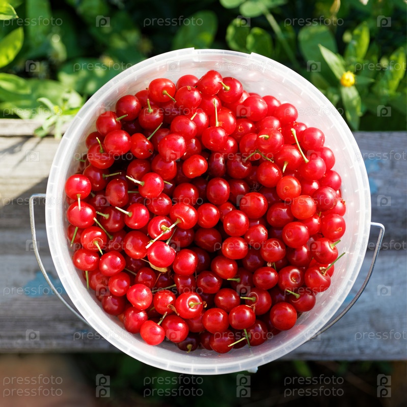Спелая красная вишня в белом пластиковом ведре