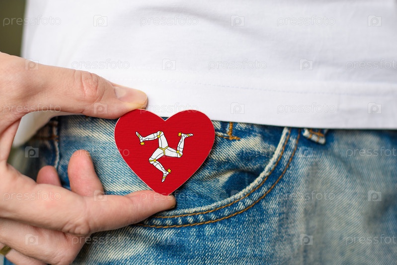 Деревянный значок с флагом острова Мэн в форме сердца в мужской руке