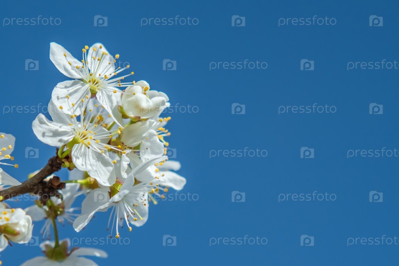 Цветущие белые цветы на ветвях яблони на фоне голубого неба