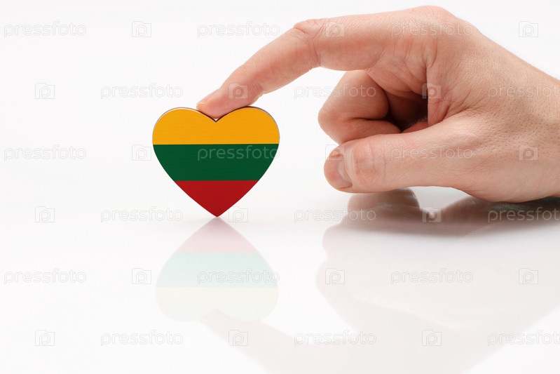 Любите и уважайте Литву. Мужская рука держит сердце в форме литовского флага на поверхности белого стекла. Концепция литовского патриотизма и гордости