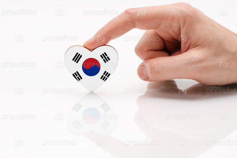 Любите и уважайте Южную Корею. Мужская рука держит сердце в форме флага Республики Корея на поверхности белого стекла. Корейский патриотизм и гордость