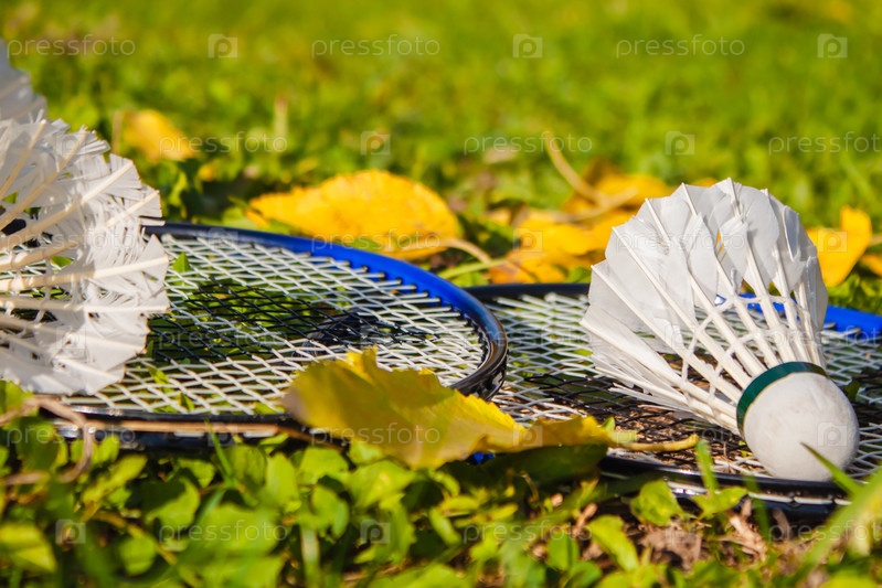 Ракетки и воланы для бадминтона лежат на траве и листьях. Крупный план