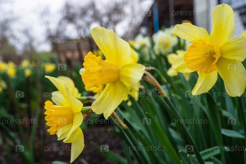 Нарциссы с желтыми цветами в естественных условиях возле дома. Группа желтых цветущих нарциссов на весенней клумбе. Нарциссы цветут в саду весенними цветами