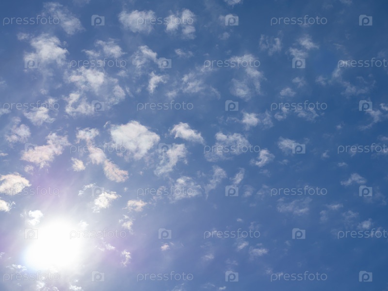 Яркое солнце светит на голубом облачном небе. Изображения жары, теплового удара, ультрафиолетовых лучей и др. Солнечные рефлексы на небе