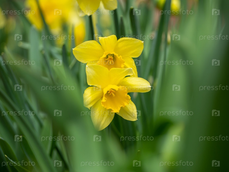 Пара желтых цветущих нарциссов в зеленой листве, фокус в центре