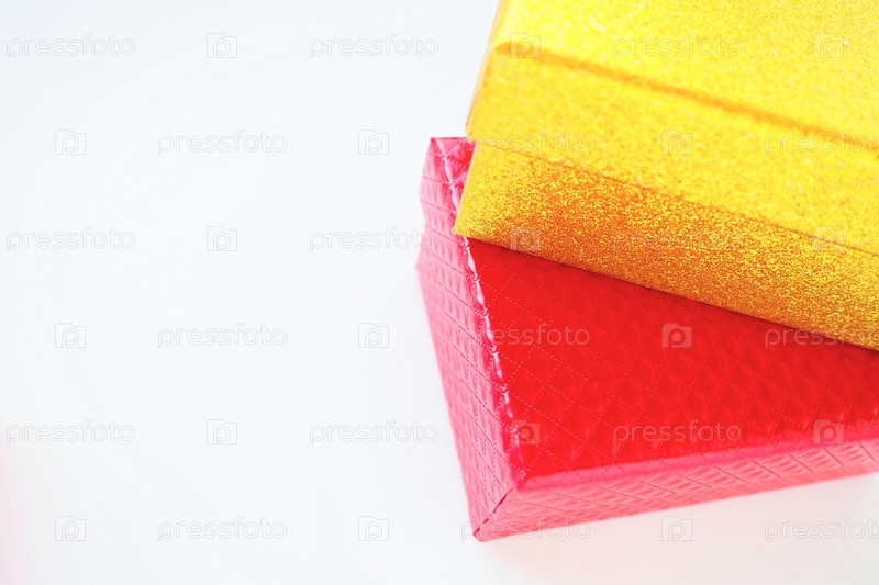 Золотые и розовые подарочные коробки на белом фоне. Декоративная праздничная коробка-сюрприз. Копировать пространство