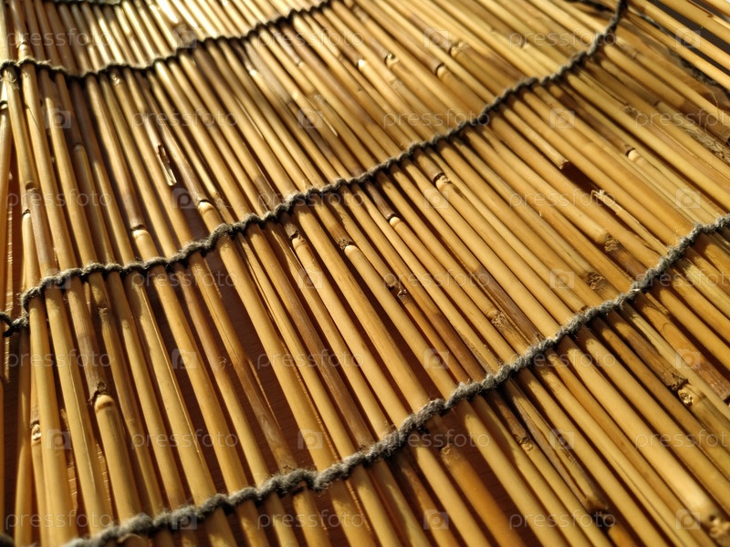 Соломенная подстилка, скатерть или небольшой коврик, разложенный на столе и сфотографированный сбоку. Мягкий вечерний солнечный свет отражается от стеблей. Некоторые палочки сломаны, нитки и веревки сплетены
