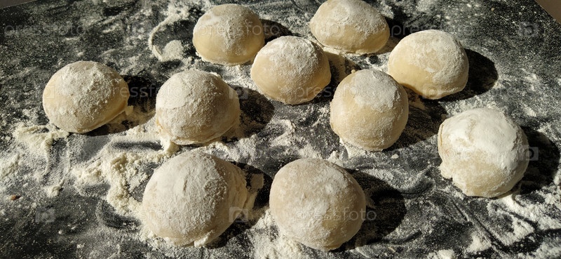 Круглые кусочки песочного теста для приготовления печенья или пряников. Сырые булочки или пельмени с разбросанной мукой на черном фоне