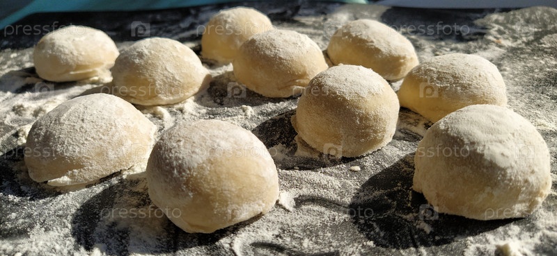 Круглые кусочки песочного теста для приготовления печенья или пряников. Сырые булочки или пельмени с разбросанной мукой на черном фоне