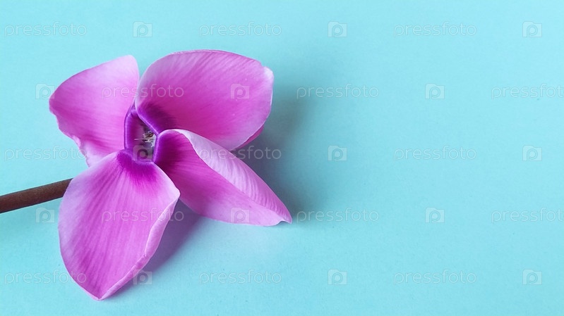 Розовый цветок цикламена на синем фоне. Нежное растение сорвано. Открытка или поздравление с 8 марта или днем матери