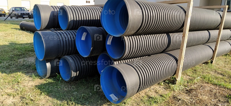 Сремска-Митровица, Сербия, 23 августа 2020 г. Металлические гофрированные трубы, синие внутри. Водопроводные или отопительные трубы лежат на земле рядом с жилым домом. Гофрированный металл. Производство технических и строительных труб