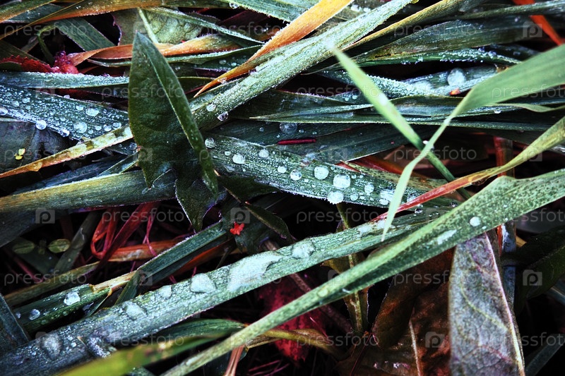 Роса или талая вода на зеленой траве. Оттаивание после утреннего зимнего мороза. Лежащая трава на лугу. Несезонная, безветренная безветренная погода. Зеленый лист с каплями воды