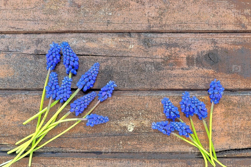 Голубые весенние цветы на деревянном фоне. Muscari armeniacum на древесном фоне. Яркая открытка, поздравления. Копируйте космический натюрморт. Темное изуродованное старое дерево. Армянский виноградный гиацинт