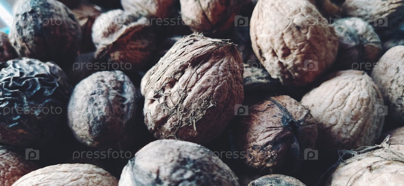 Грецкие орехи крупным планом. Сбор орехов. Плоды грецкого ореха, округлые крупные одиночные односемянные костянки. Здоровая диета, включающая глицериды линолевой, олеиновой, стеариновой, пальмитиновой и линоленовой кислот. Мягкий фокус