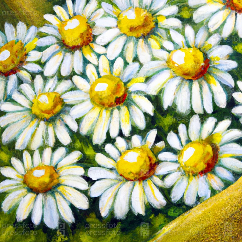 Белые цветы ромашки. Дизайн открытки или этикетки. Рисунок в акриловом стиле. Желто-оранжевая серьга в виде цветка. Аромат ромашки аптечной. Крупные цветущие соцветия на зеленом фоне. Луг