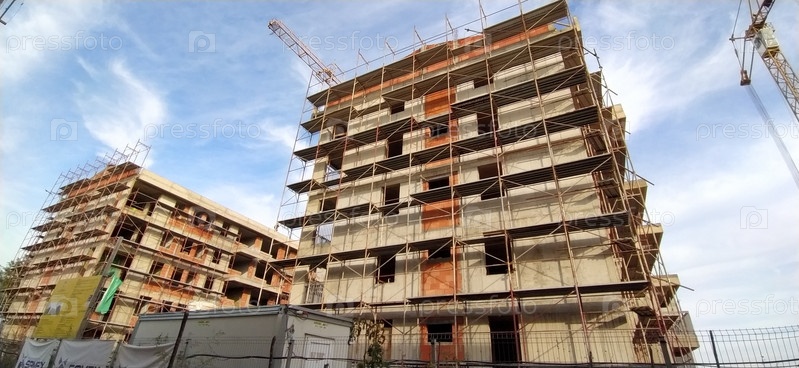 Строительство квартала пятиэтажных домов из монолитного бетона. Промышленность, строительство, недвижимость. Фасад здания, строительные леса. Новые технологии строительства в сейсмоопасных районах