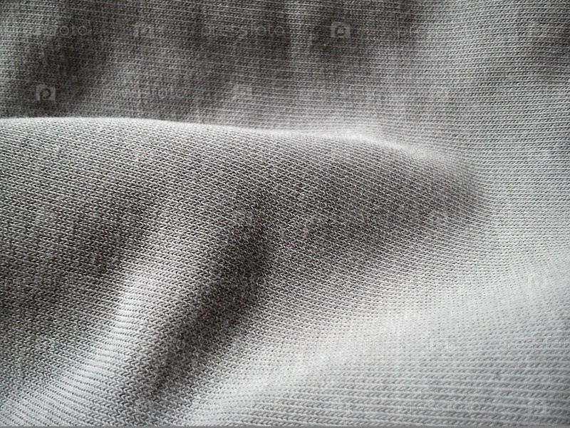 Фактура серого трикотажа, слегка сложенная волнами или морщинистая. Игра света и тени на полотне машинной вязки при естественном дневном освещении. Мягкий плотный хлопковый материал
