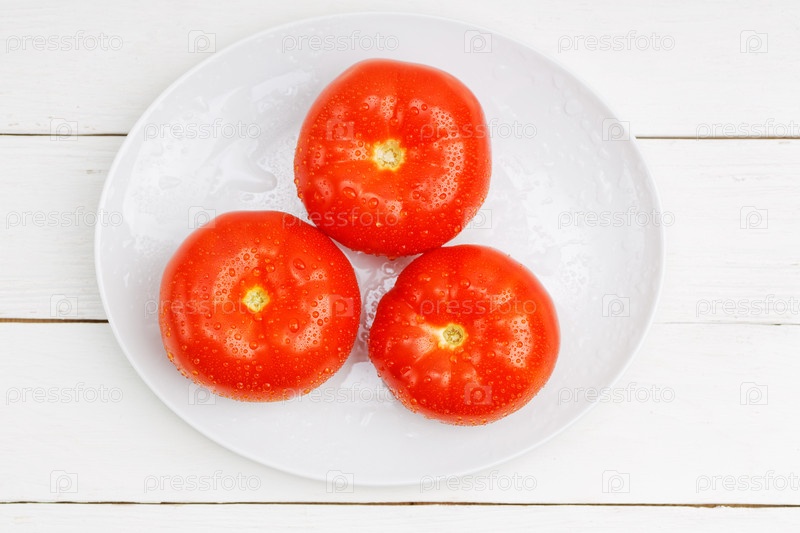 Крупным планом три красных спелых влажных помидора с каплями воды