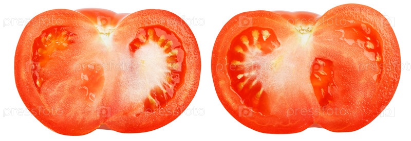 Крупный план двух наполовину спелых красных помидоров, изолированных на белом