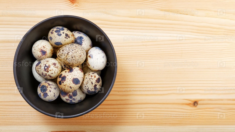 Маленькие перепелиные яйца с пятнами в темно-коричневой миске