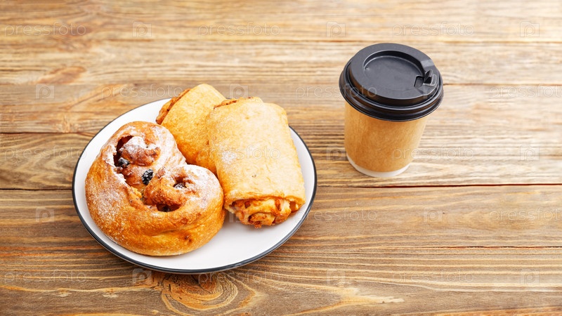 Свежая выпечка и бумажная чашка кофе