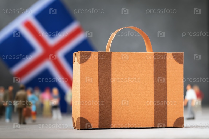 Картонный чемодан, пластиковые игрушечные люди и флаг на абстрактном фоне, концепция на тему переезда или иммиграции в Исландию