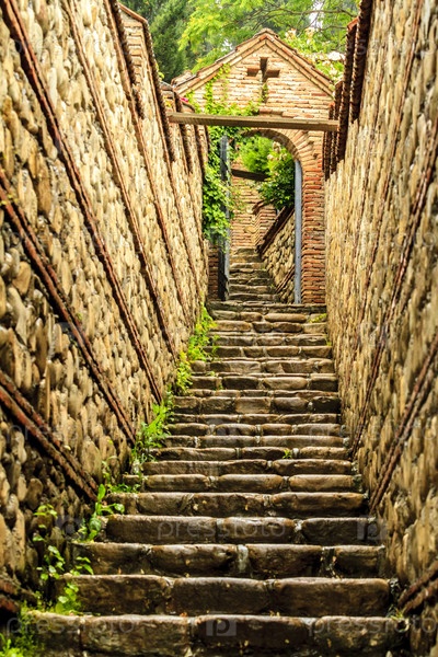 Монастырь Святой Нино в Бодбе, Грузия. Каменные лестницы и каменная арка после дождя
