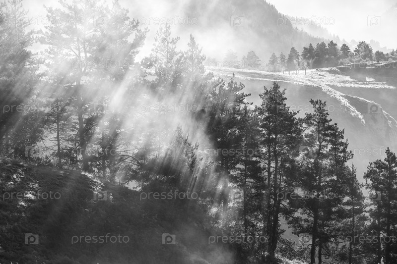 Утренний туман в лесу, солнечные лучи пробиваются сквозь туман, Грузия, Тушетия
