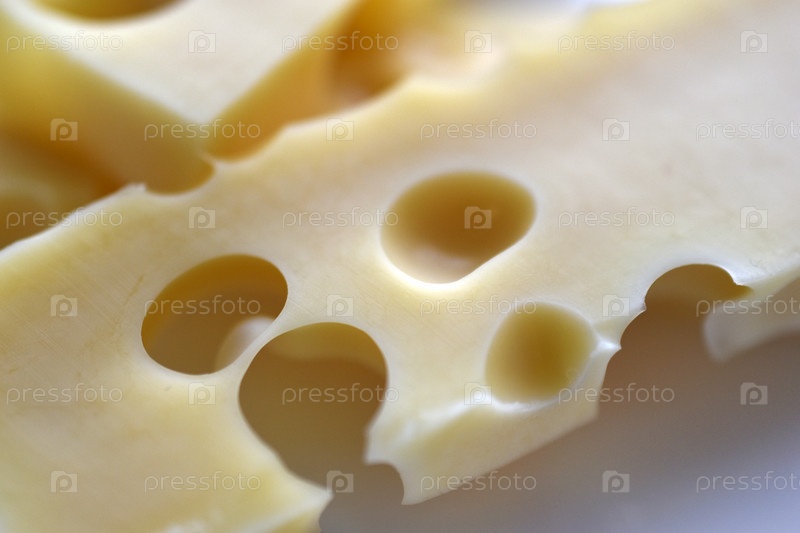 Кусочки желтого сыра с большими отверстиями на белом фоне. Вкусный сыр крупным планом