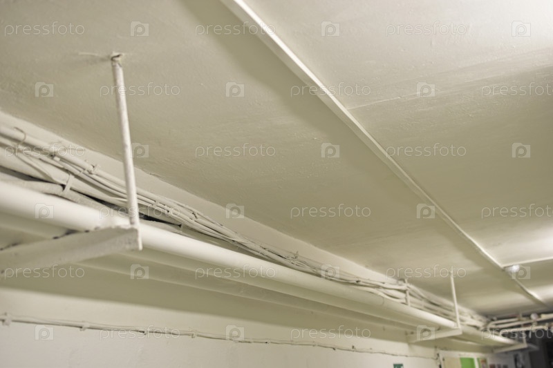 Белые водопроводные трубы и отопление в подвале. Побеленные трубы под потолком и провода в доме. Железные водопроводные трубы в доме