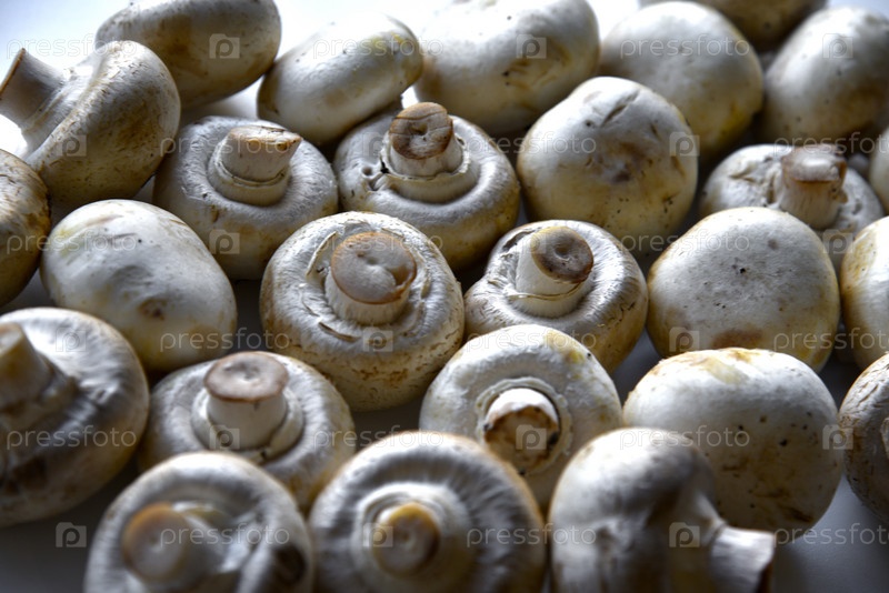 Большие плоды шампиньонов на белом фоне. Много грибов крупным планом
