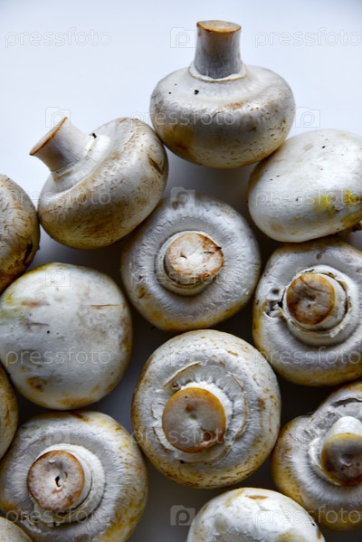 Большие плоды шампиньонов на белом фоне. Много грибов крупным планом
