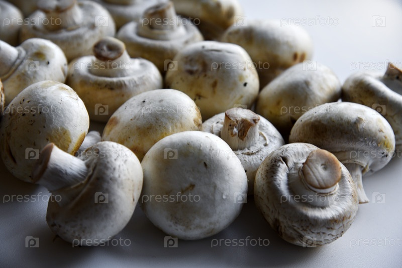 Большие плоды шампиньонов на белом фоне. Много грибов крупным планом