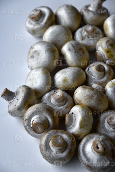 Большие плоды шампиньонов на белом фоне. Много грибов крупным планом