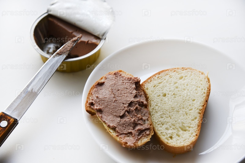 Мясной паштет и хлеб с ножом. Намазывание паштета ножом на хлеб на белом фоне