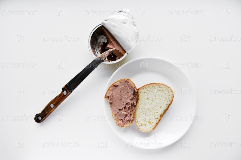Мясной паштет и хлеб с ножом. Намазывание паштета ножом на хлеб на белом фоне
