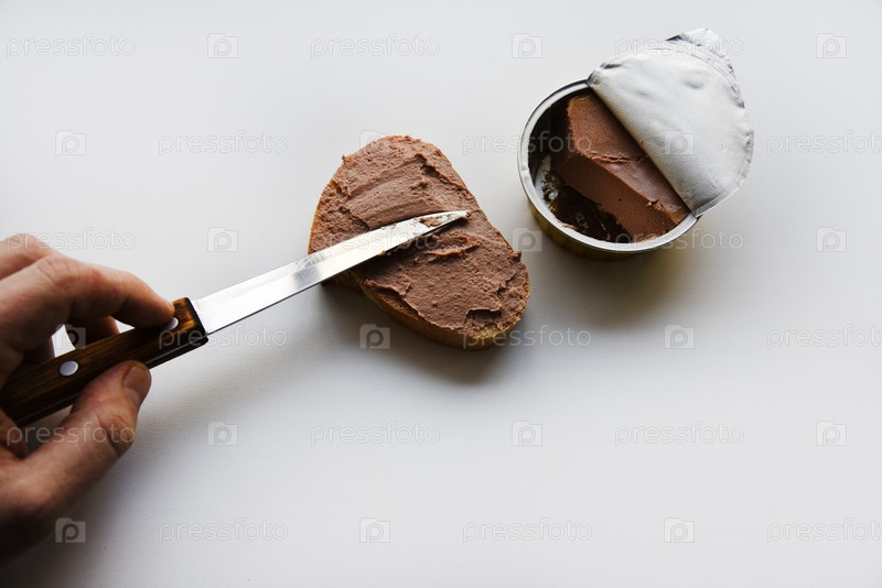 Мясной паштет в банке на белом фоне. Намазывание паштета на хлеб ножом. Мясной паштет, нож и хлеб. Вкусный завтрак из паштета