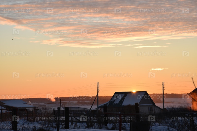 Закатный пейзаж в сельской местности зимой. Заходящее солнце за крышей дома вечером. Диск солнца и вечерний закат. Желтый розовый красивый закат и небо