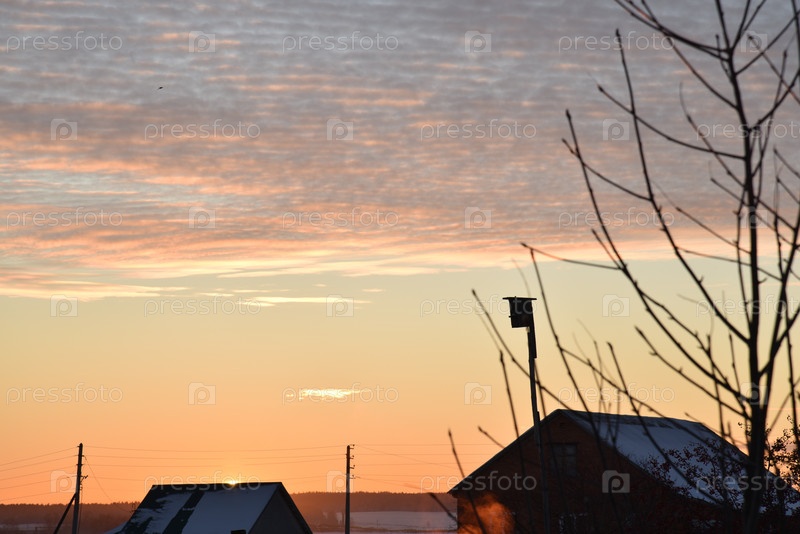 Закатный пейзаж в сельской местности зимой. Заходящее солнце за крышей дома вечером. Диск солнца и вечерний закат. Желтый розовый красивый закат и небо
