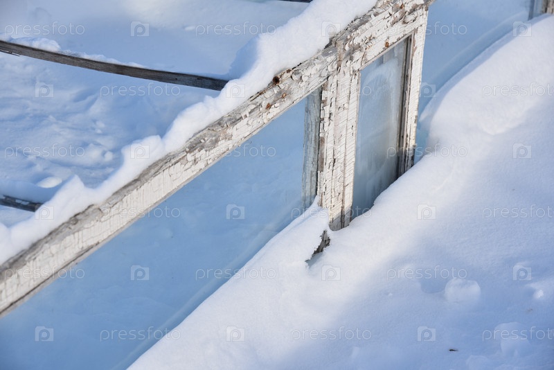 Деревянные ящики зимой в снегу. Небольшая теплица в сугробах зимой