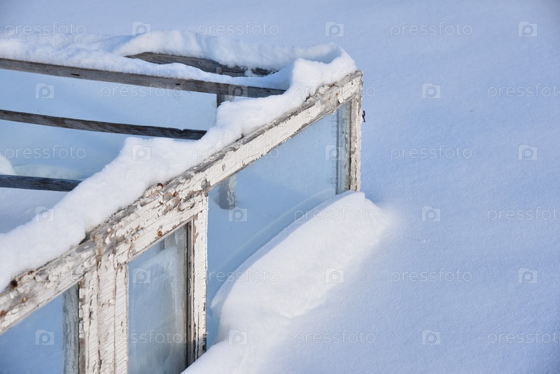 Деревянные ящики зимой в снегу. Небольшая теплица в сугробах зимой