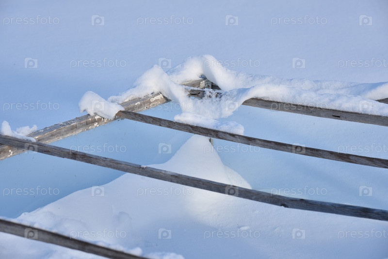 Деревянные ящики зимой в снегу. Небольшая теплица в сугробах зимой