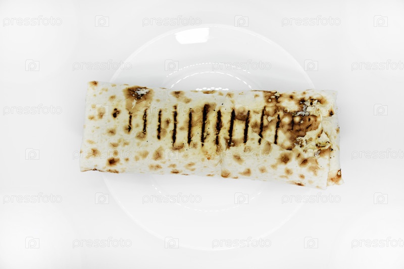 Шаурма на белой тарелке. Буррито. Вкусная мясная шаурма на белом фоне