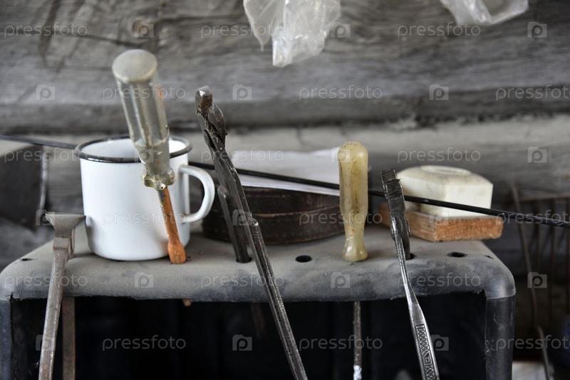 Старые инструменты в пыльном сарае. Инструменты в гараже на полке