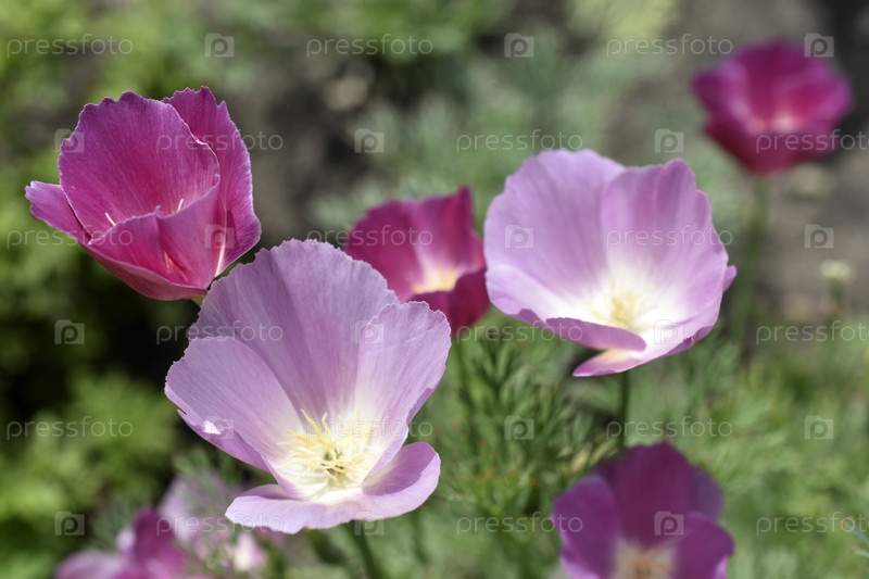 Синие цветы ашшольции на зеленом кусте днем. Красивые цветы ашшольции