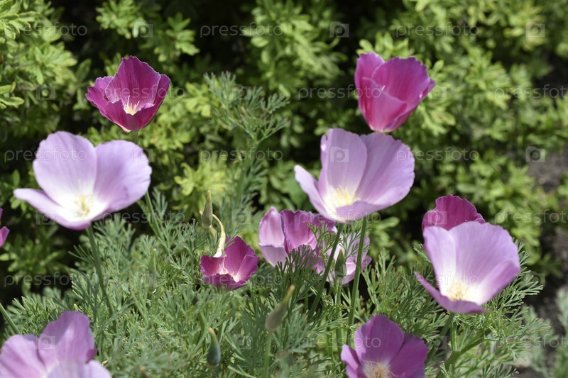 Синие цветы ашшольции на зеленом кусте днем. Красивые цветы ашшольции