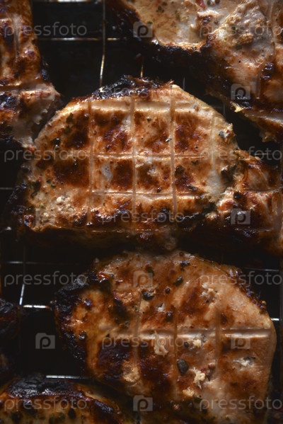 Кусочки жареной свинины. Барбекю. Вкусная жареная свиная вырезка. Куски мяса крупным планом. Мясо на углях