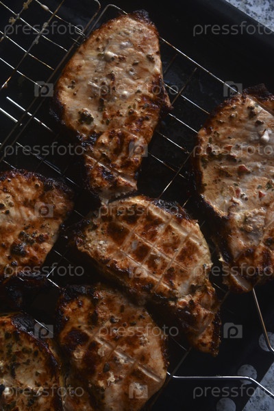 Кусочки жареной свинины. Барбекю. Вкусная жареная свиная вырезка. Куски мяса крупным планом. Мясо на углях