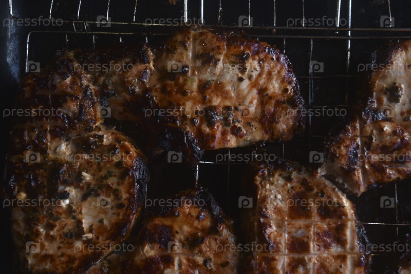 Кусочки жареной свинины. Барбекю. Вкусная жареная свиная вырезка. Куски мяса крупным планом. Мясо на углях