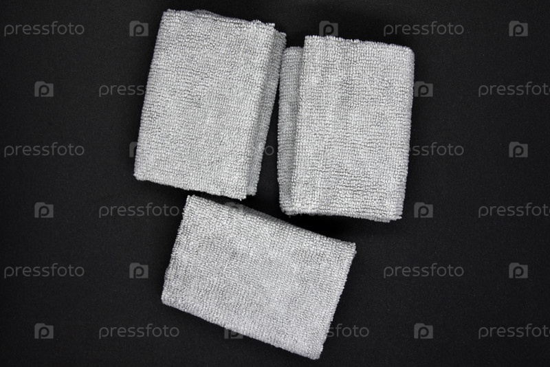 Три серых полотенца на черном фоне. Махровые салфетки для протирки мебели. Полотенца на черном фоне